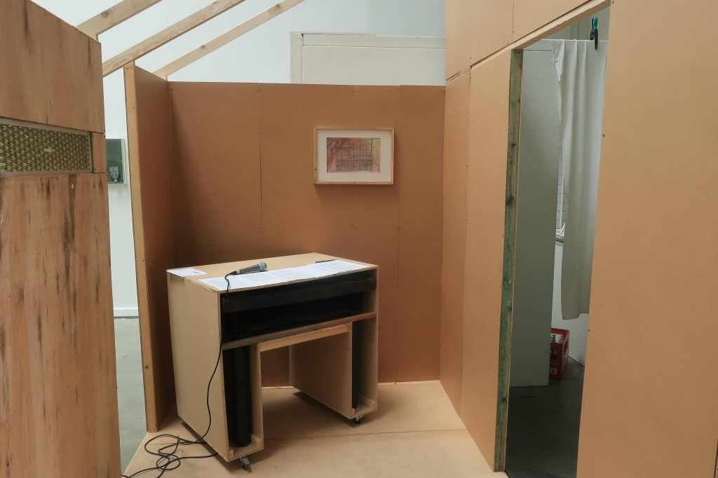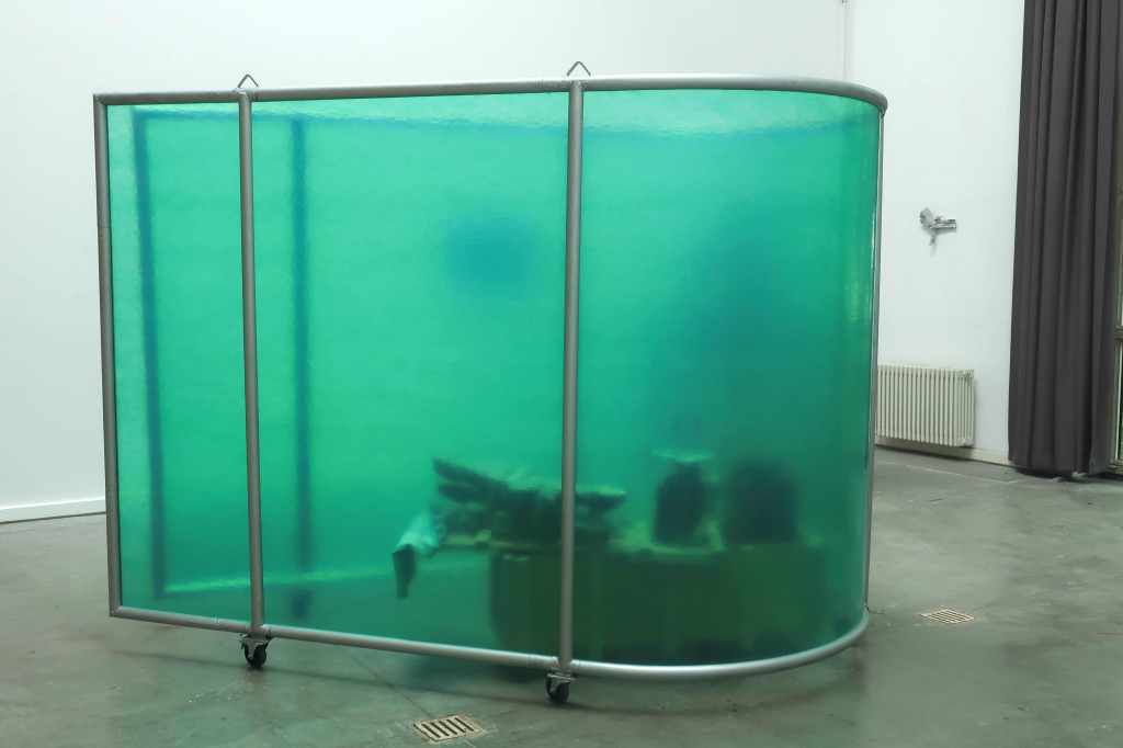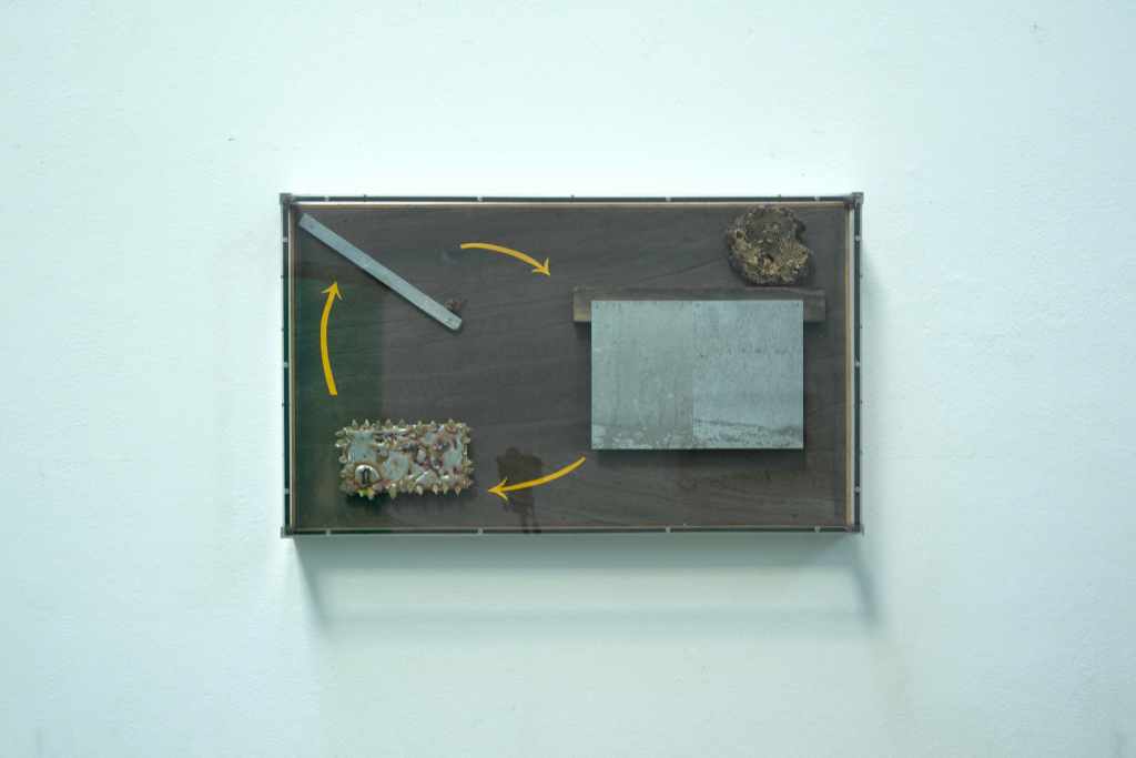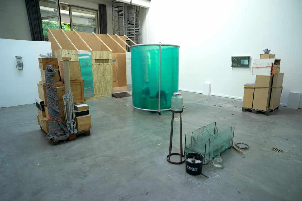 During the opening of the exhibition on July the fifth, the space was activated with two actors, Emma Tietze and Luca Cottier. Salt and water where mixed, the new substrate analyzed; boxes were opened and their contents described, texts were read.